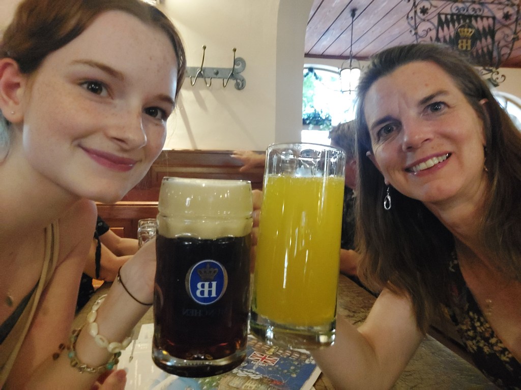 Next on the list was the Hofbrauhuas, Munich’s famous beer hall. With its vaulted ceilings and stained glass windows it felt like a church – a really fun church with a jolly oompah band (note the lederhosen), waitresses in traditional dress offering baskets of jumbo pretzels, and beer glasses bigger than your head. I had the ‘half’ size (yes, the 16 year old has my drink in the photo. She tried it and didn’t like it) and it must have contained at least a pint.